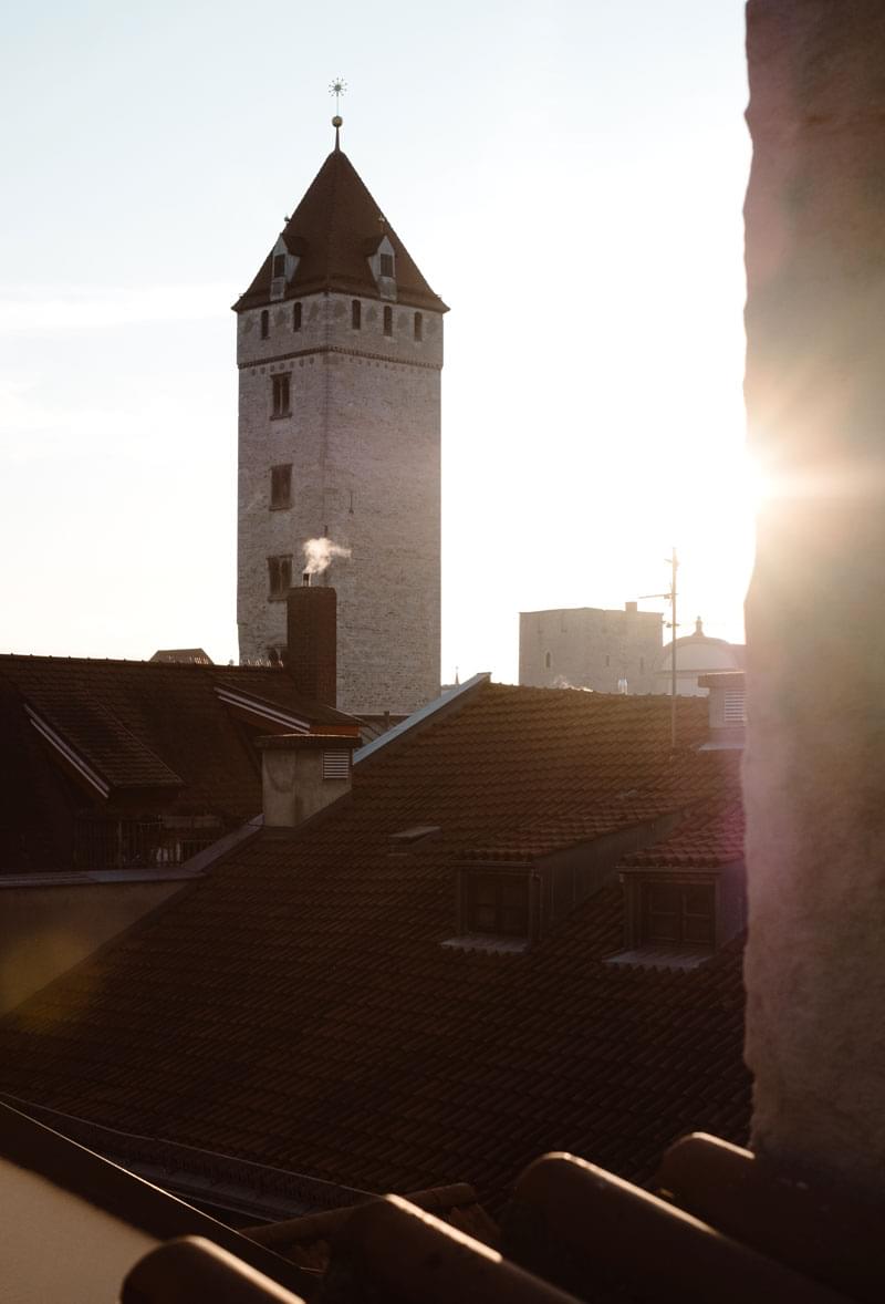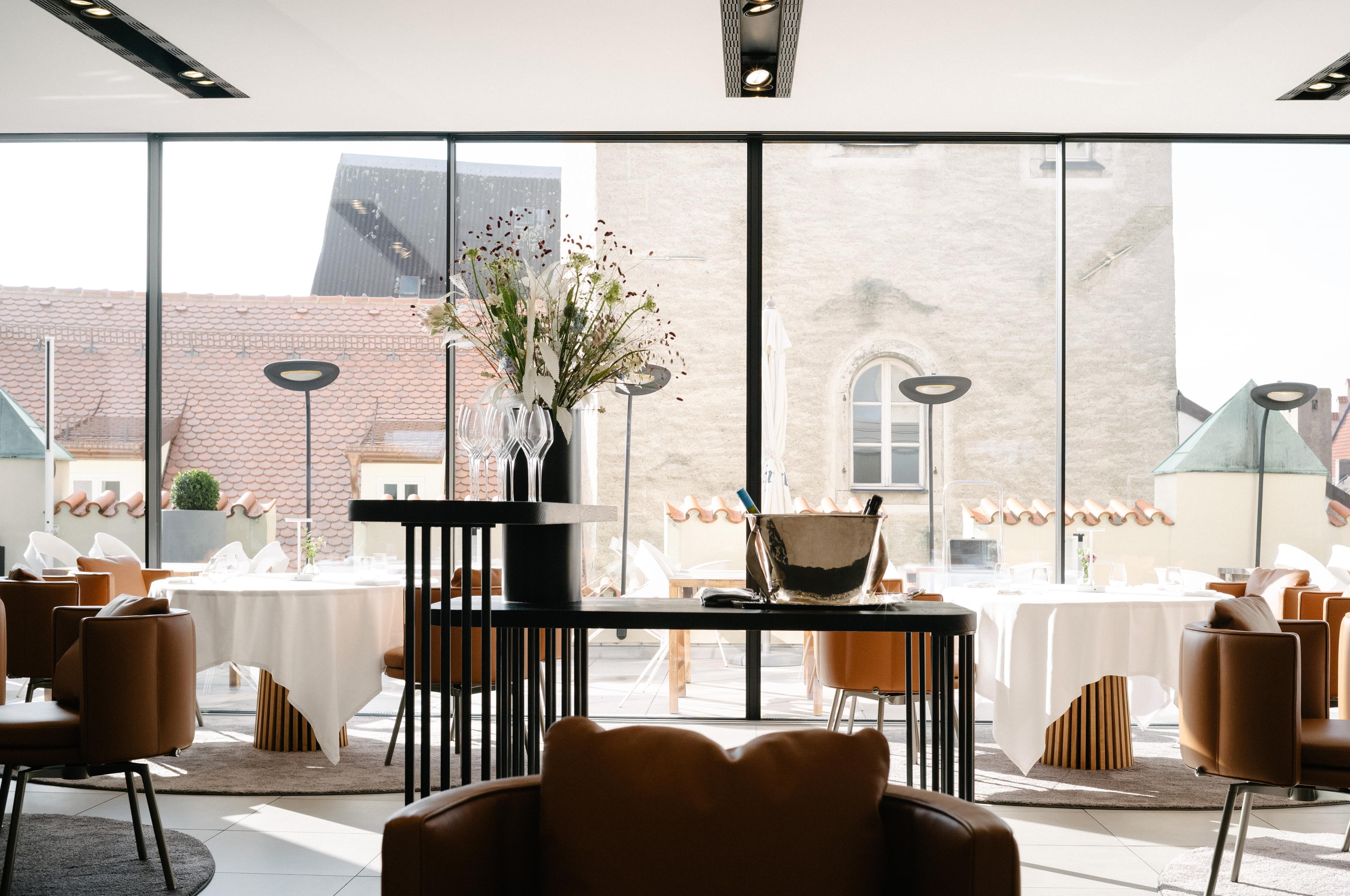 Scandinavian Fine Dining im fünften Stock einer mittelalterlichen Patrizierburg. Junge, akzentuierte Sterneküche in clean reduziertem Interieur. Draußen die mittelalterlichen Dächer. Drinnen: Großstädtisch. Kosmopolitisch. Aufregend.
