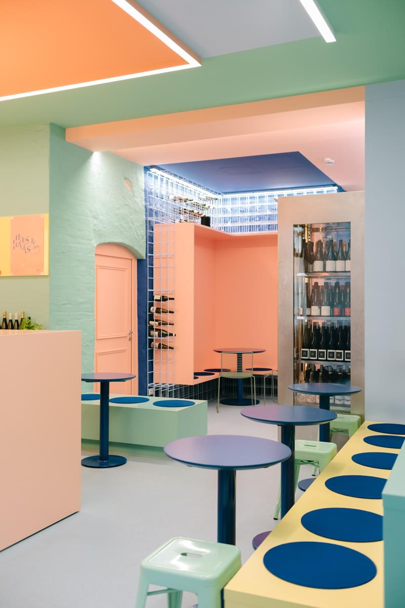 Das Tipsy ist ein knallbuntes Wohnzimmer, eine quietschige Küche, ein lauer Abend in einer futuresken Stadt. Ein überdimensionierter Sitzblock erinnert an Küchenpartys, Sitzstufen vermitteln das Gefühl urbaner Strukturen, poppige Metallgitter sind die Regale und das alles in einer surrealen Farbkombi zwischen Miami Vice und Cannes. Eine Atmosphäre, die leicht sediert und wie ein Champagnerrausch an einem Urlaubstag die Zeit vergessen lässt.